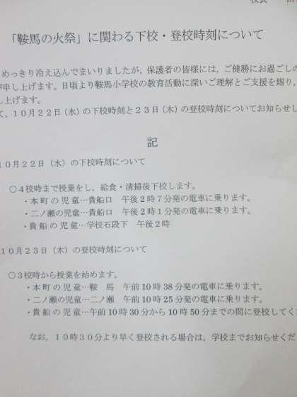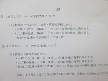 本日と明日の登下校時刻については,別紙プリントでお知らせしたとおりです。各ご家庭で変更等ございましたら,学校までお知らせいただきますようお願いいたします。