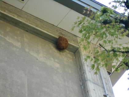 駆除の方法は,長い棒の先に蜂蜜と薬を混ぜた布きれをつけて,それを巣の穴に差し込むというものでした。穴は1か所なので,巣の中にいるハチも,外から巣に戻ってきたハチも,必ず薬を吸うことになり,10〜15分で死ぬそうです。作業は3階のベランダから行いました。