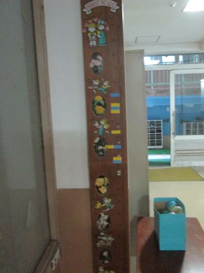 昨日何人かの鞍馬っ子が保健室前にある“キリン”と背比べをしていました。各学年の全国平均身長も掲示されていました。