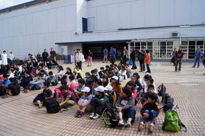 最初に諸注意を聞きます。その後は学年ごとに分かれて学習します。
