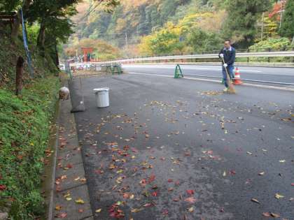 今朝も落ち葉が散っています。管理用務員さんが学校内外を清掃しています。