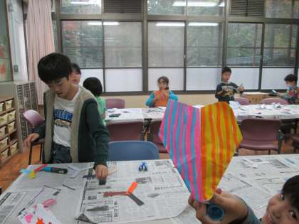 ブーメラン・紙飛行機を教えていただいています。児童は張り切って飛ばそうとしていました。