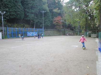 教務主任が山に入ったボールをとってくれました。児童のキック力がついた証拠です。次はコントロールです!