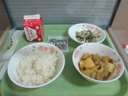 今日の給食は,麦ごはん・牛乳・肉じゃが(カレー味)・切干大根の煮つけ・じゃこです。
