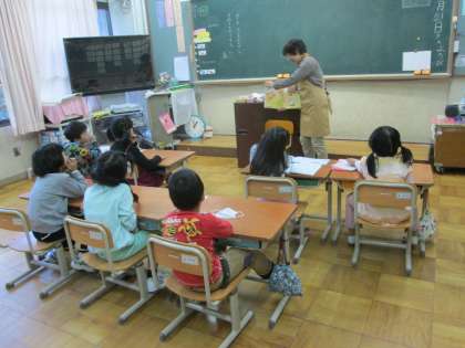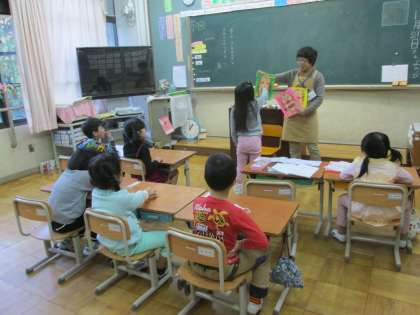 今日の読み聞かせは『いいからいいから』(長谷川義史さんの絵本)です。気持ちのよいホッとする内容です。1年生は神妙な顔で,やがて‘つぶやきから感想’を持っていました。主人公ののおじいちゃん,思わず笑みがこぼれてきます。