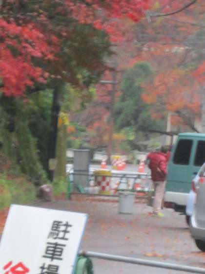 大量の落ち葉が地面にくっついています。管理用務員さんが竹ぼうきで掃いています。