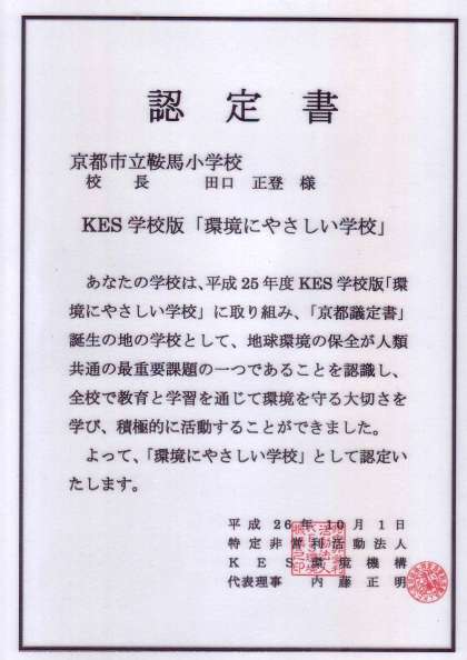 鞍馬小学校はKES学校版に取り組み,「環境にやさしい学校」として認定されました。先日のクリーン活動などが高く評価されています。今後も環境の保全に取り組んでいきたいと思います。