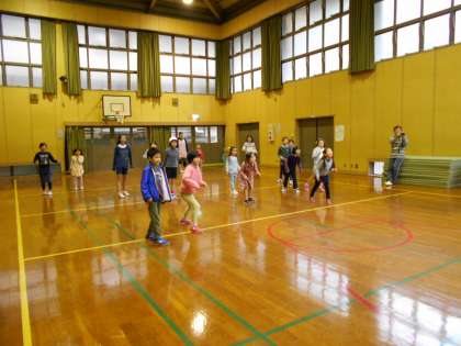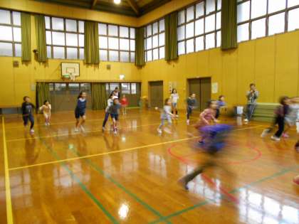 小雨が降っているので,中間ランニングはお休みです。体育館の全校遊びは,「だるまさんがころんだ」でした。