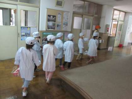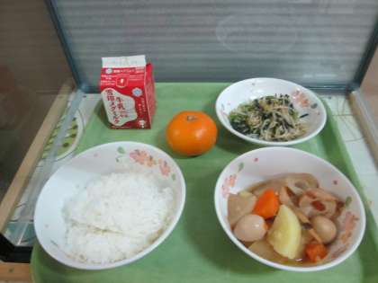 今日の給食は,ごはん・牛乳・関東煮・もやしと小松菜のごまいため・みかんです。よく噛んでいただきましょう。
