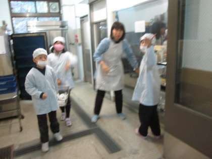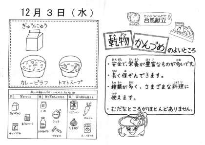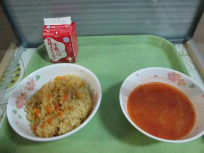 今日の給食は,カレーピラフ・牛乳・トマトスープです。『台風献立』です。