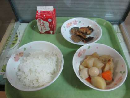 今日の給食は,ごはん・牛乳・さんまのかばやき風・関東煮です。