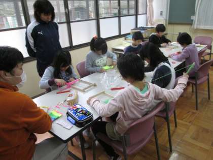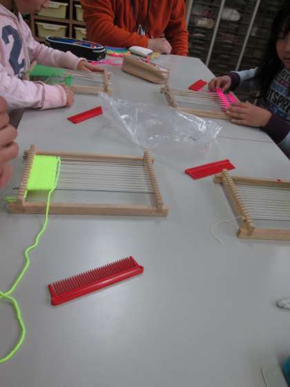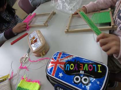 糸と織物グッズを使った体験学習です。『家でもやりたいな…』とつぶやいています。