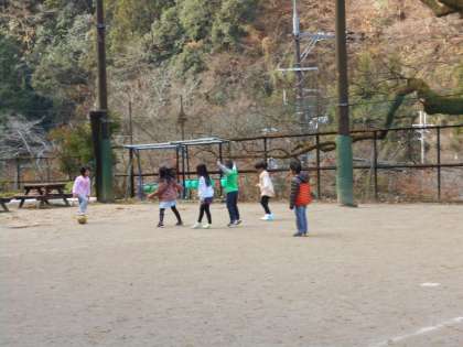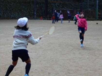 気温は4度です。1年生は7人でサッカー,3年生は4人でバドミントンをしています。