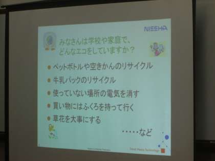 今日の3・4時間目,3年〜6年生が“エコライフチャレンジ”学習をしました。日本写真印刷様からお越しいただき,身近なエコから地球規模の温暖化問題まで教えていただきました。