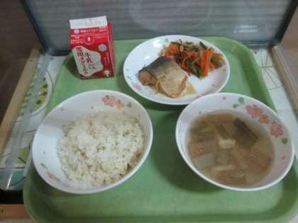今日の給食は,麦ごはん・牛乳・さばのみそ煮・野菜のきんぴら・ずいきのくずひきです。『さばの骨』,うまく取れたでしょうか?