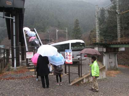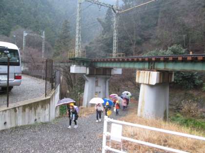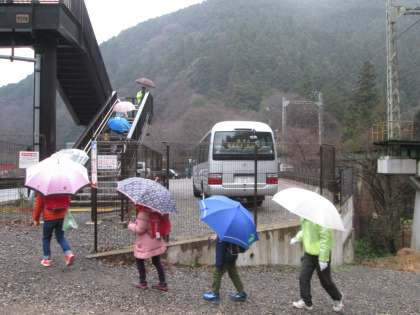 小雨が降っています。傘をさしての登校です。河川工事の方も来られていました。
