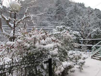 石段上の池も凍っています。