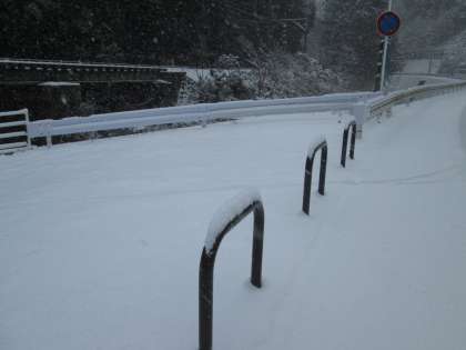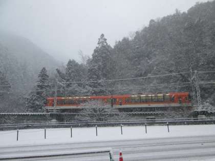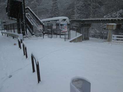 電車が雪の中を走っています。歩道橋付近の様子は雪景色です。