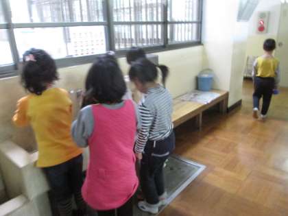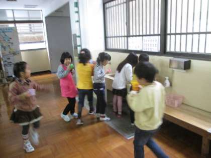 “フッかぶつせんこう”をしています。ブクブクうがいをして,虫歯を予防しています。