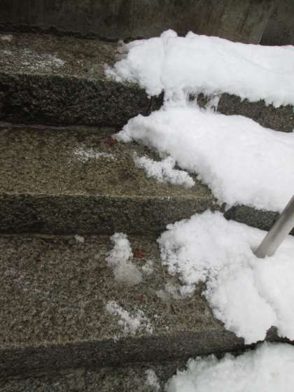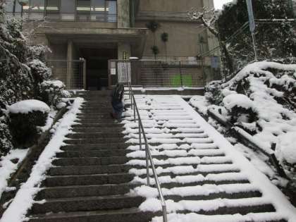 左側(北側)だけは整備しました。手すりも拭きました。管理用務員さんと教頭先生が,夕方以降の凍結防止の為に,凍結防止剤をまいています。