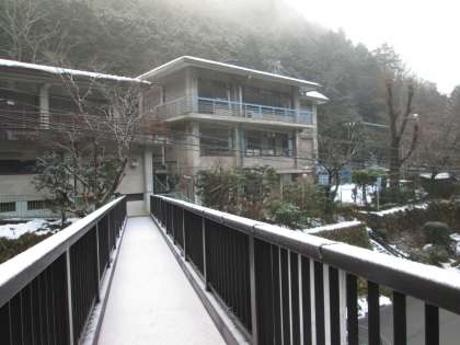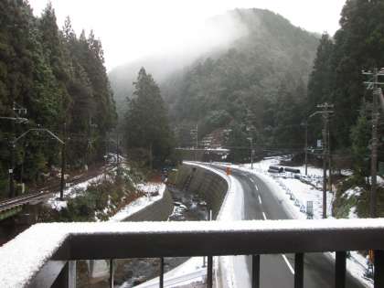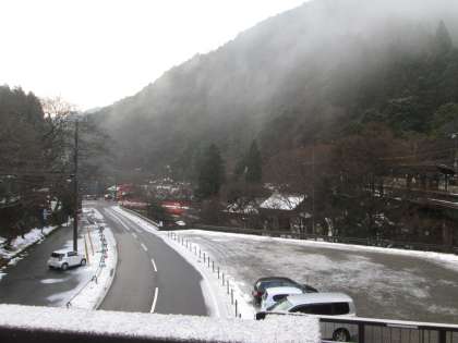 朝から学校周辺に霧が出ていました。歩道橋はうっすら雪が積もっています。