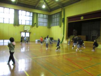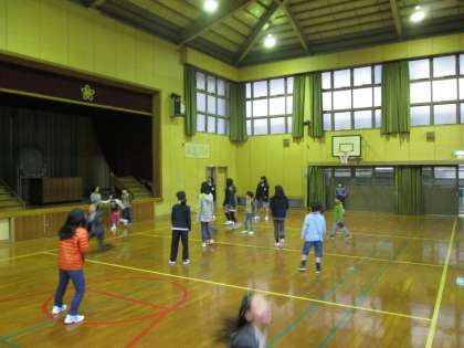 運動場には水たまりが…。今朝は,また体育館での朝遊びです。洛北中学生も一緒に遊びました。小学生も喜んでいます。