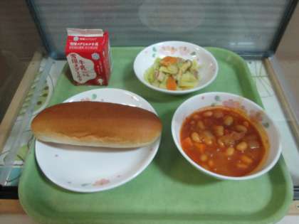 今日の給食は,味つけコッペパン・牛乳・大豆と鶏肉のトマト煮・きのこのソテーです。コッペパンは噛めば噛むほど“味”があります。ソテーの繊維質は胃腸に良さそうです。