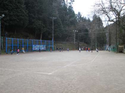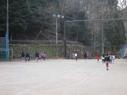 運動場が凍っています。でこぼこに気を付けて遊びましょう。