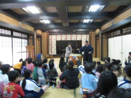 昨日の“太鼓と獅子舞のミニライブ”の追加画像です。珍しい楽器の紹介や,教職員・中学生も登場しました。