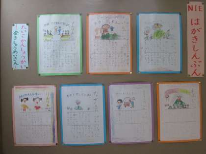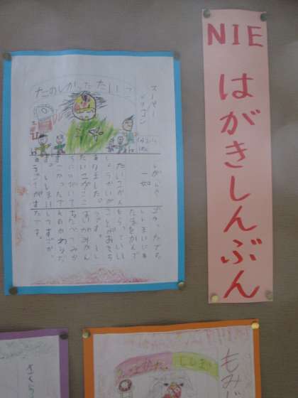 1年生の掲示板に『はがき新聞』が掲示してありました。先日の太鼓と獅子舞鑑賞のことが書かれていました。