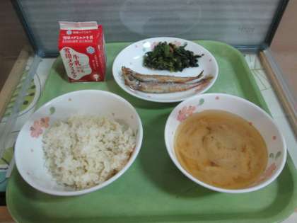 今日の給食は,麦ごはん・牛乳・ししゃものからあげ・ほうれん草のおかか煮・さつまいものみそ汁です。ししゃものからあげは人気メニューです。
