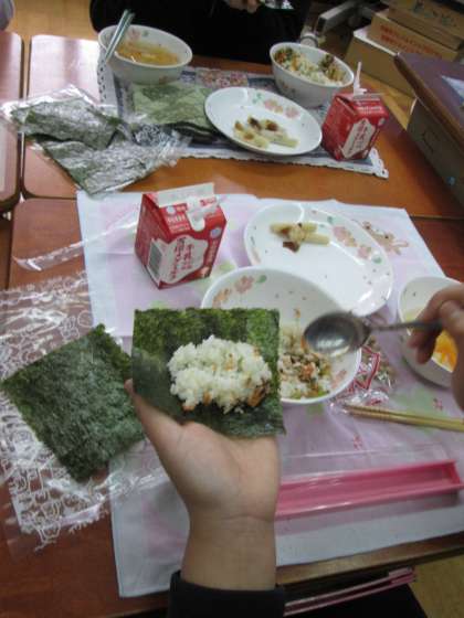 具とご飯を混ぜて…,スプーンで海苔に乗せて…,手で巻いて…,