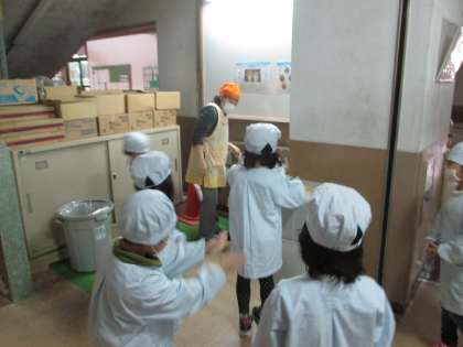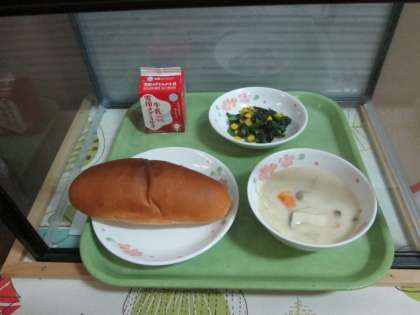 今日の給食は,ミルクコッペパン・牛乳・きのこのクリームシチュー・ほうれん草のソテーです。午後から電車に乗って鞍馬山へ出かけます。時間通りに食べられるようにしましょう。