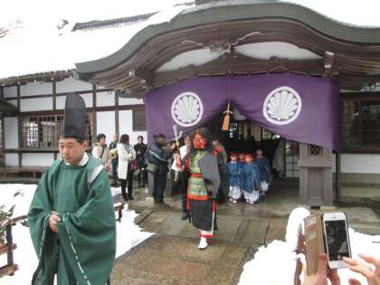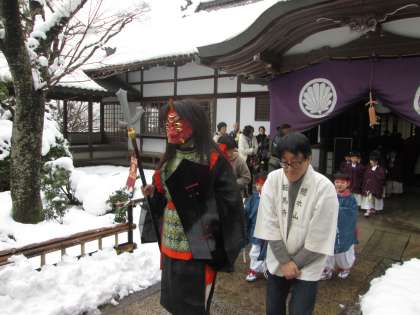 鬼とお稚児さんの列が雪道を歩いて行きます。