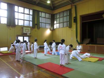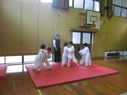 赤い畳を6畳敷いて,低学年に教えていただきました。マットを用意して投げ技を稽古します。