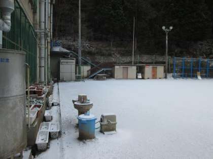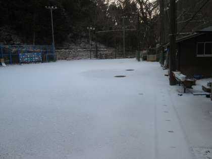 今朝の運動場は真っ白です。積雪量はそれほど多くありませんが,池も凍っていて,相当冷え込んでいます。