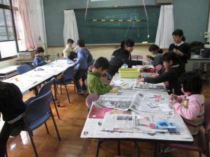 今日の手作り教室は,ペン,はさみ,ひもなどを使っての活動です。できた作品を引っ張ると…。