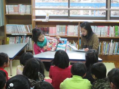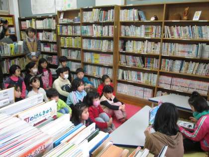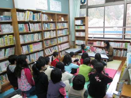 高学年が,下級生に『本の読み聞かせ』をしています。高学年児童は朝休みに練習していたそうです。聴く児童もみんな真剣です。