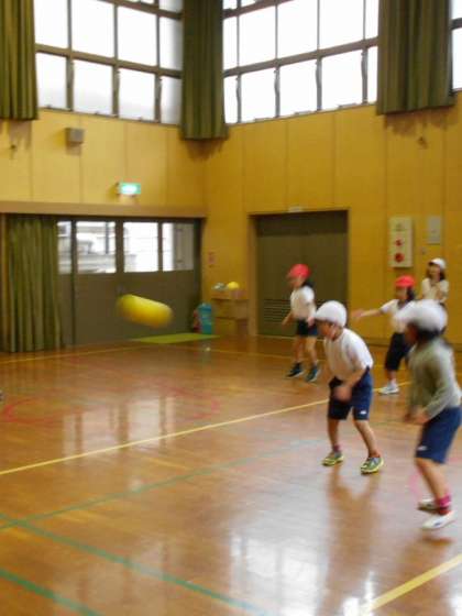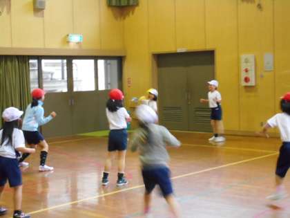 外は雪が降り続いています。でも,体育館の中では子どもたちが元気に運動しています。体が温まったので,ほとんどの子が半袖シャツ1枚です。
