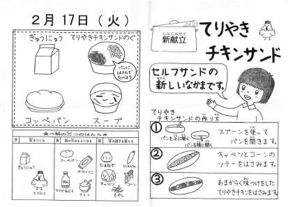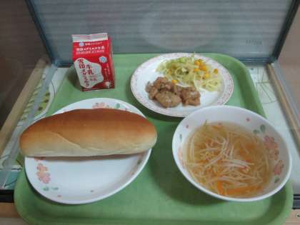 今日の給食は,コッペパン・牛乳・新献立のてりやきチキンサンド(具)・スープです。セルフサンドにしていただけたでしょうか?