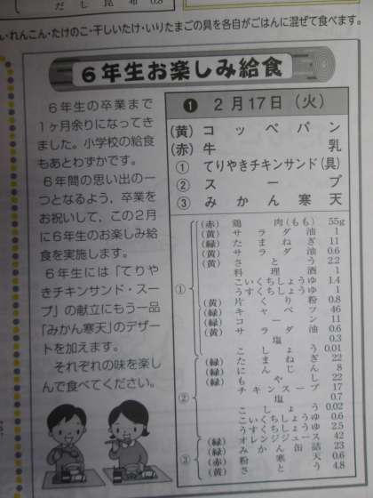 6年生の卒業まで,あと20回と少しの給食です。6年生には卒業をお祝いして,デザートとしてみかん寒天がつきます。『6年生お楽しみ給食』ですね。