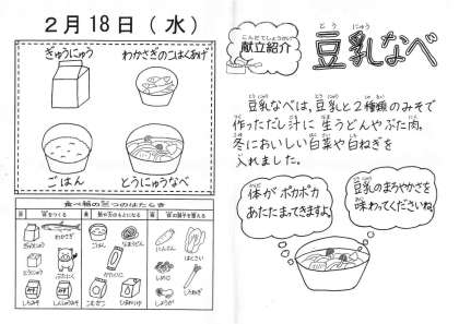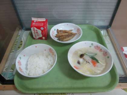 今日の給食は,減量ごはん・牛乳・わかさぎのこはくあげ・豆乳鍋です。鍋の中には野菜や豚肉・生うどんが入っています。