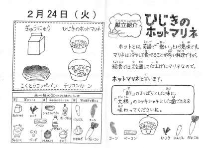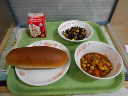 今日の給食は,黒糖コッペパン・牛乳・チリコンカーン・ひじきのホットマリネです。給食週間中の取組として,今日は【交流給食】でした。