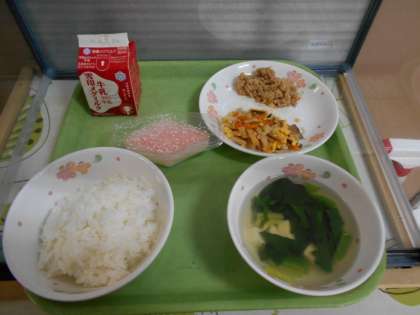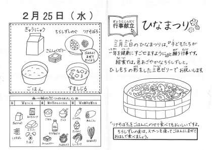 今日の給食は,ごはん・牛乳・ちらしずし(具)・ツナそぼろ・すまし汁・三色ゼリーです。『ひな祭り献立』です。