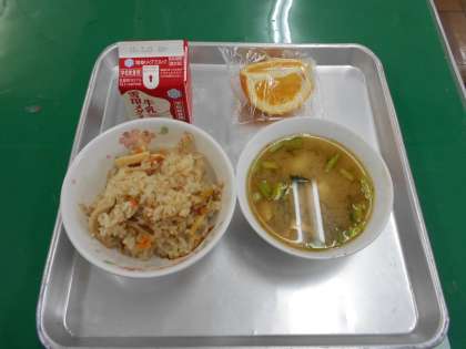 さて,今日の給食は,炊きこみ五目ごはん・牛乳・みそ汁・はっさくです。はっさくをいただく時に,むき方など,困る児童がいるかもしれませんね。