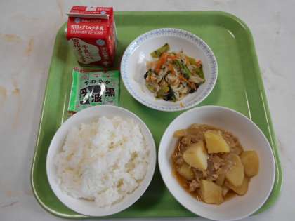 今日の給食は,ごはん・牛乳・じゃがいものそぼろ煮・小松菜と切干大根の煮びたし・黒大豆です。