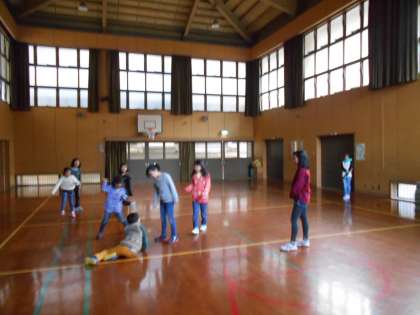 急に雨がぱらついてきました。運動場から体育館に変更です。