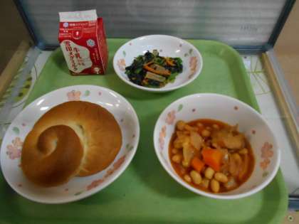 今日の給食は,バターうずまきパン・牛乳・大豆と鶏肉のトマト煮・ほうれん草のソテーです。今年度最後の『パン給食』です。