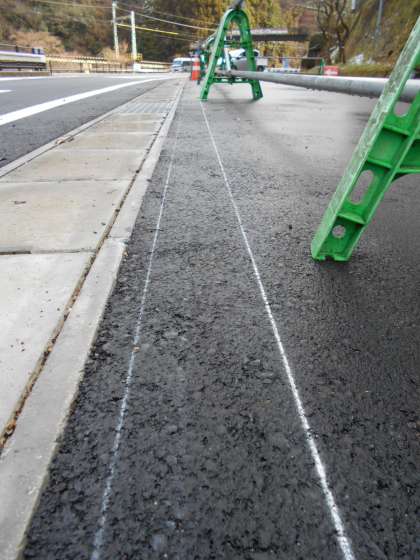 現在の貴船口バス停(南向き)は,観光シーズンになると乗降客があふれて危険なため,北に上がったところに『臨時バス停』を設けるそうです。画像はその準備図の線かもしれませんね。