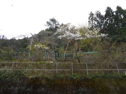 スロープや体育館の桜が満開です。山とのコントラストがきれいです。